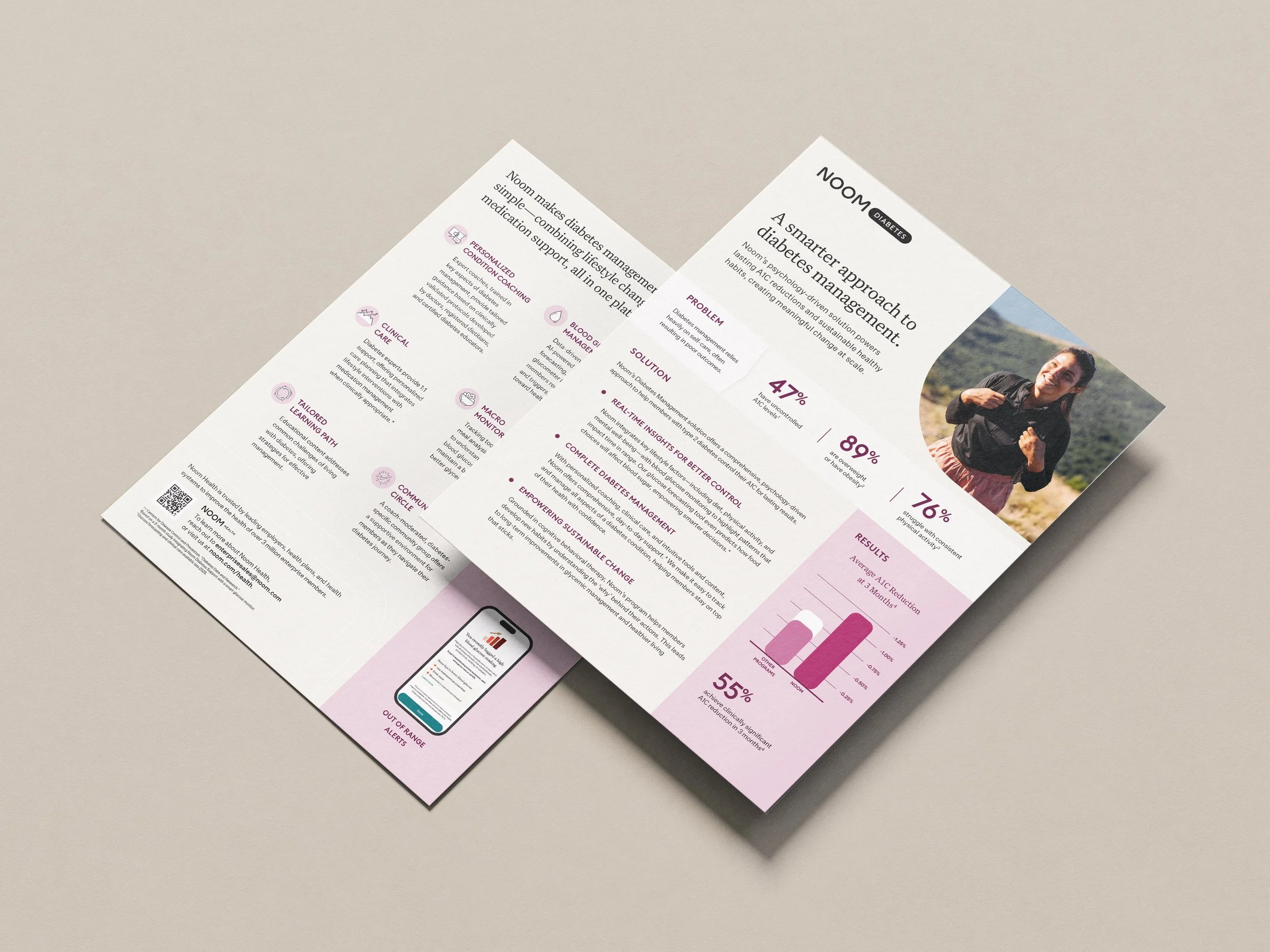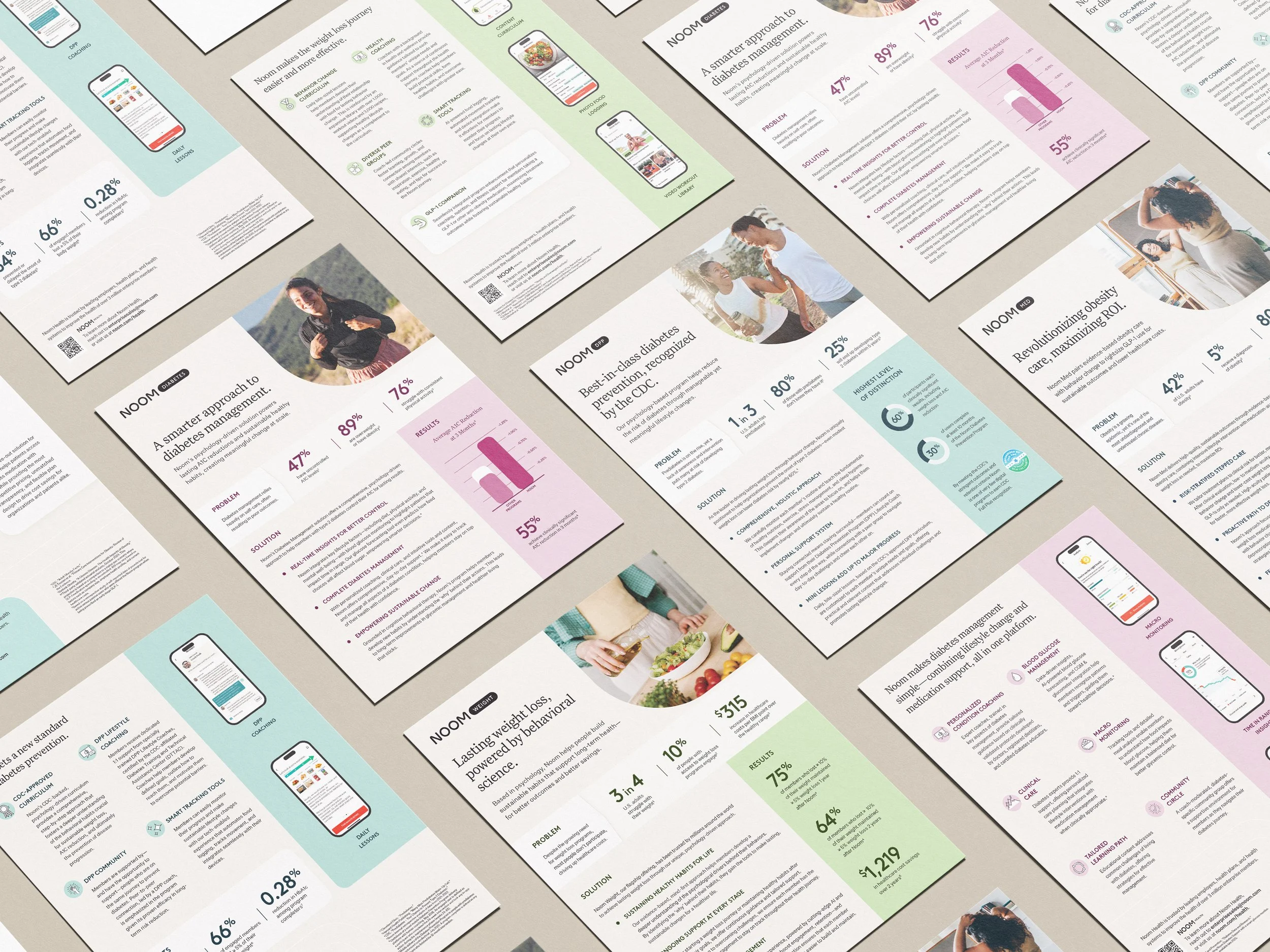 The B2B ecosystem includes educational flyers, product sell sheets, seasonal collages, and modular microsites. Together, these assets create a unified brand experience, allowing Noom’s visual language, thinking, and health-focused philosophy to resonate across both live activations and partner-facing materials.
